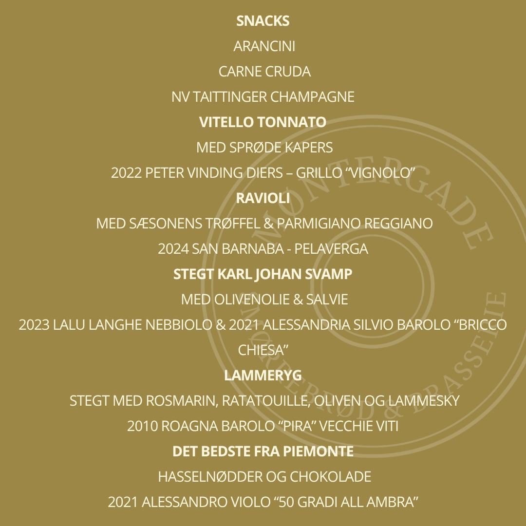 Glæd dig til en uforglemmelig aften, hvor vi hylder det bedste fra det italienske Piemonte – med mad, vin og stemning i absolut særklasse.
